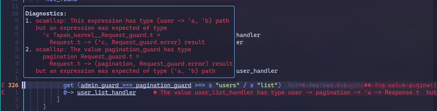 s "users"→('a, 'a) path(no parameters extracted)/ int64→(int64 -> 'a, 'a) path(adds int64 parameter)get→ Wraps in Method GET@-> user_handler→ Requires handler of typeint64 -> Request.t -> Response.t