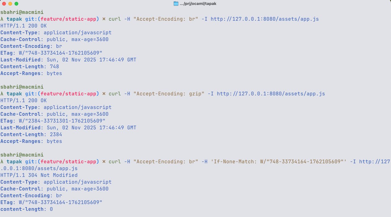 Another feature I found lacking in OCaml web frameworks is robust static file serving. Both Opium and Dream provide static file serving, but they simply serve files from a directory with limited support for advanced optimizations, such as range requests, conditional requests, caching headers, pre-compressed files with content encoding negotiation, and other optimizations that are important for serving static files efficiently.